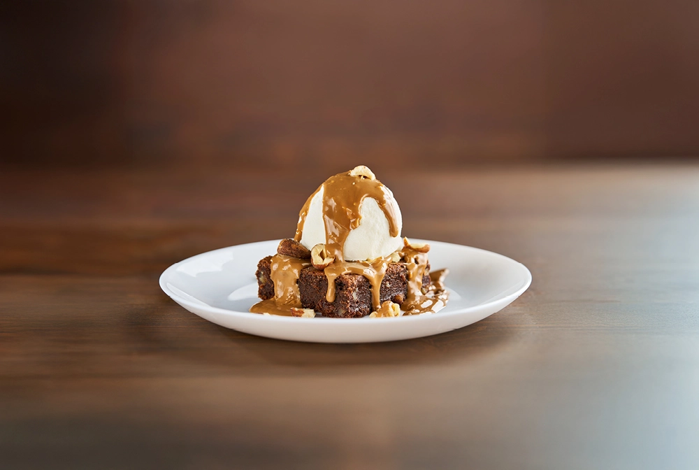 Chocolate cake* with pecan nuts, accompanied by fiordilatte ice cream, salted caramel topping and mixed dried fruit