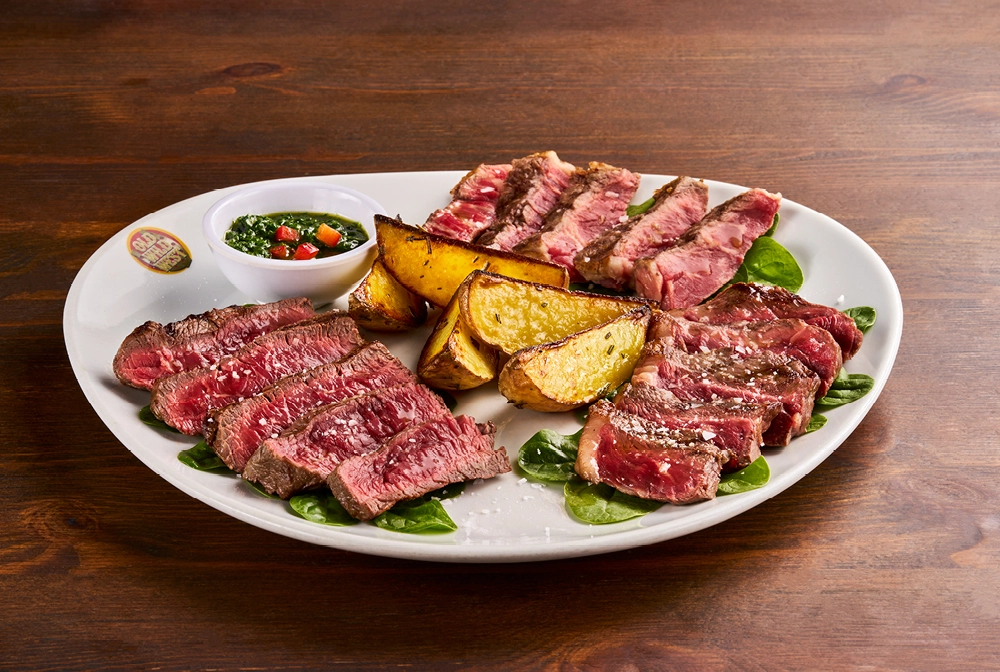 The best of our meats consisting of sliced Picanha steak, entrecôte and rump steak, seasoned with extra virgin olive oil and salt flakes, on a bed of baby spinach, all accompanied by oven-baked potatoes and home-made Chimichurri sauce