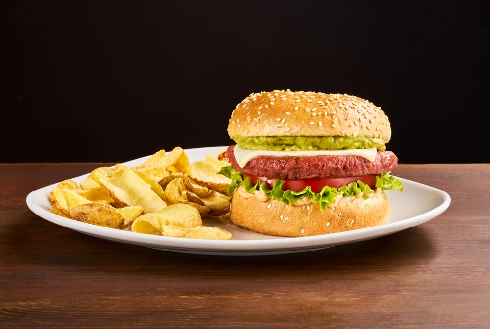 Sesame seed bun*, burger* no meat (100% plant-based protein burger), melted cheese, Guacamole sauce, tomato, iceberg lettuce and OWW sauce, served with Premium Fries*