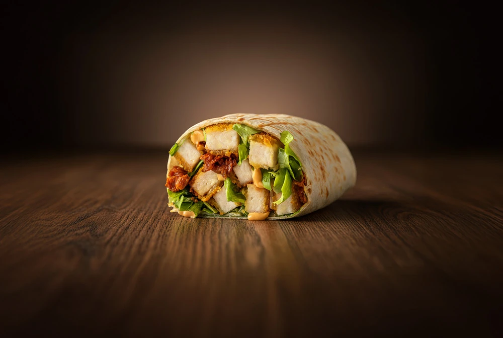 Wheat tortilla filled with breaded chicken cutlet*, sun-dried tomato cream, Parmigiano Reggiano PDO shavings, lettuce, and OWW sauce