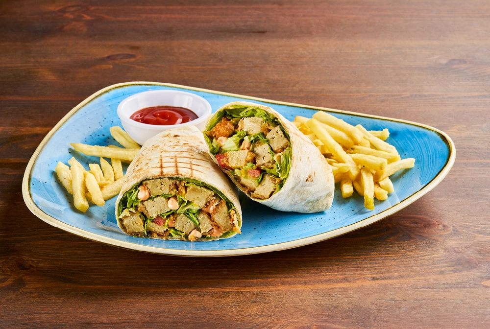 Wheat tortilla filled with breaded strips*, vegan cheese slices, salad, diced tomato, plant-based mayonnaise sauce with sun-dried tomato cream, served with French Fries* and ketchup