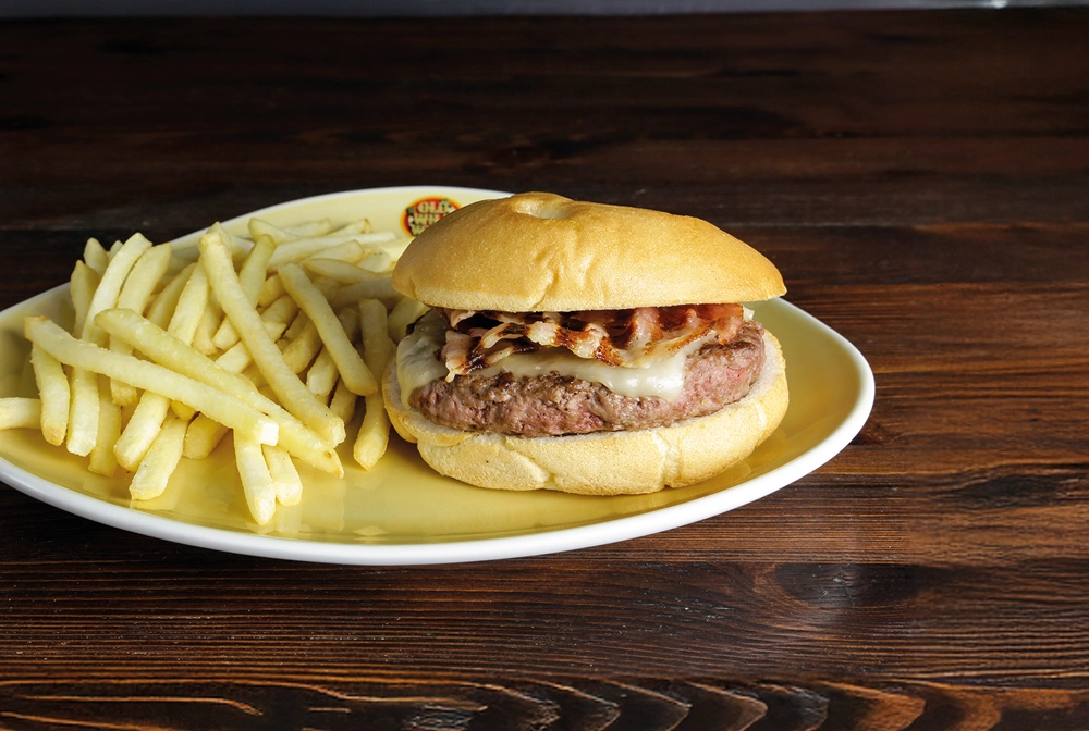 Panburger (prodotto da forno* a base di farina di riso e amido di mais), hamburger*, formaggio fuso e bacon, servito con patate* Fries e salsa OWW