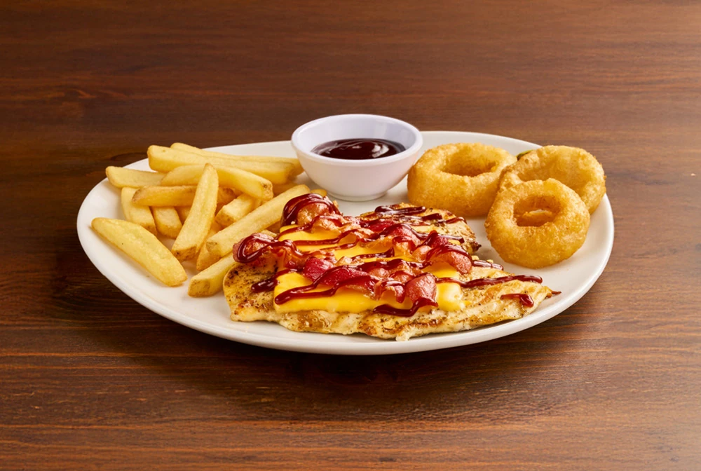 Petto di pollo* alla griglia con bacon, formaggio fuso con Cheddar, onion rings* e salsa Barbecue, il tutto servito con patate* Fries