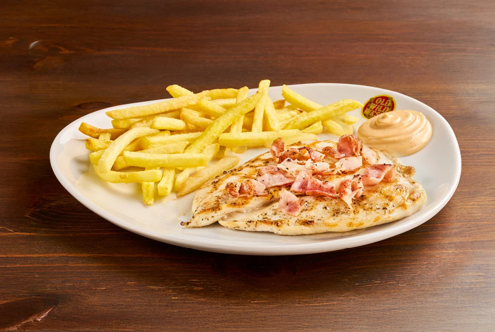 Petto di pollo* alla griglia con bacon croccante, servito con patate* Fries e salsa OWW