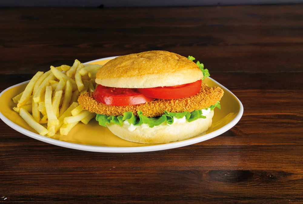 Panburger (prodotto da forno* a base di farina di riso e amido di mais), cotoletta di pollo* panata, pomodoro, insalata e maionese vegetale, servito con patate* Fries e salsa OWW