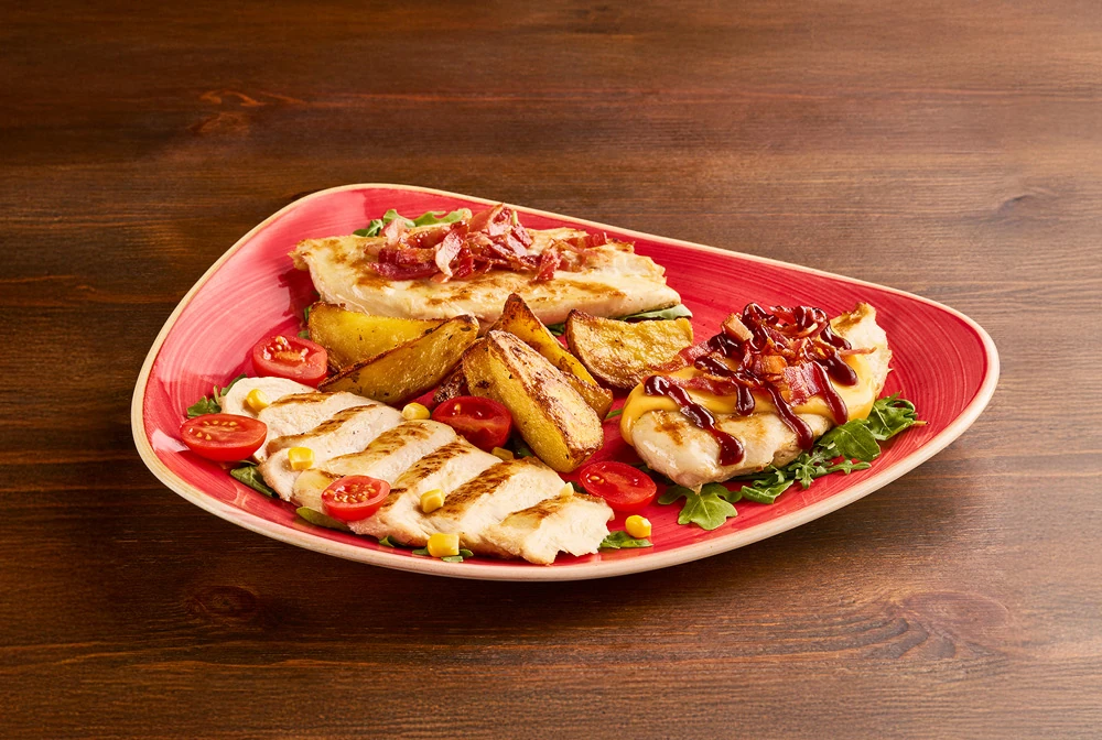 Un tris dei nostri migliori piatti di pollo: Mackenzie, Cheyenne e Barbecue accompagnati da rucola e patate al forno
