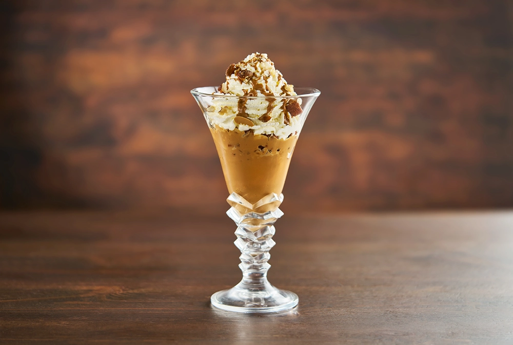 Gelato al fiordilatte, topping al caramello salato, panna montata, e mix di frutta secca