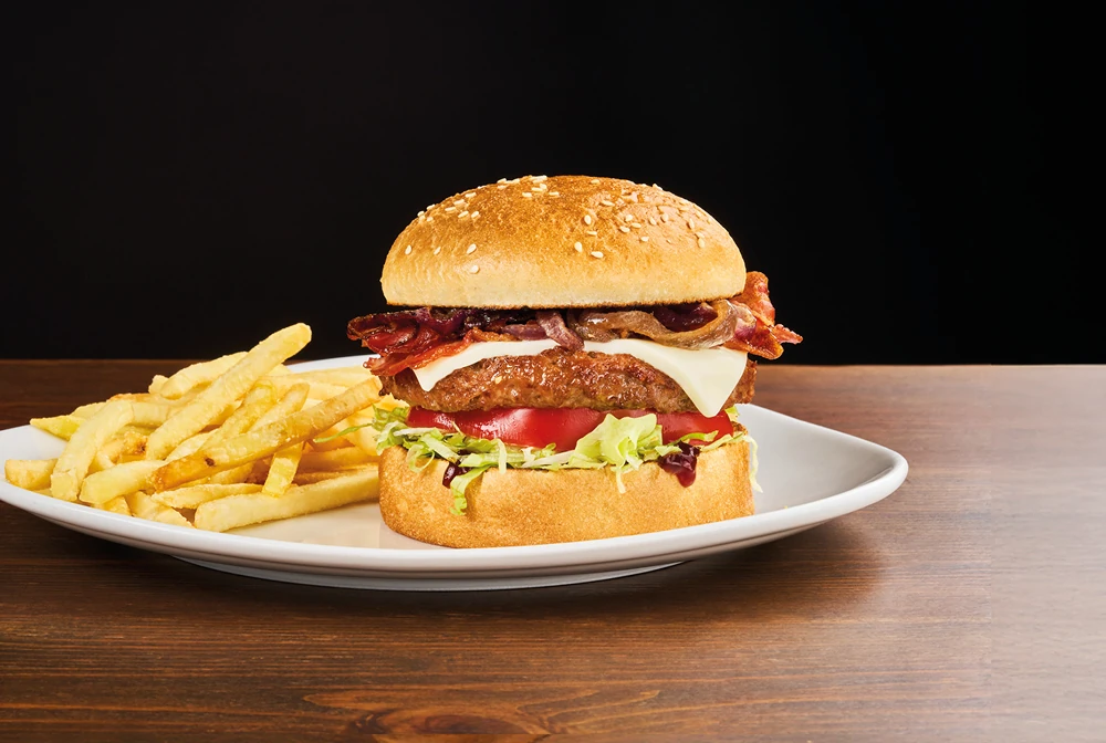 Panino con semi di sesamo*, hamburger*, formaggio fuso, bacon, onion relish, pomodoro, insalata iceberg e salsa Barbecue, servito con patate* Fries e salsa OWW