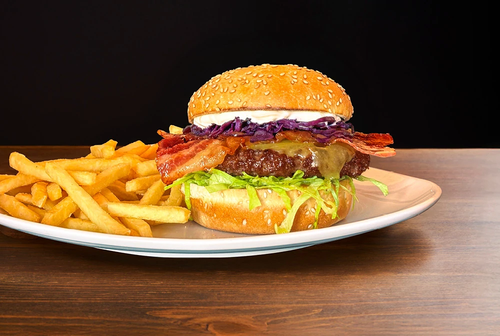 Panino con semi di sesamo*, hamburger*, formaggio Cheddar affumicato, bacon, Korean sauce, insalata iceberg, cappuccio rosso condito e maionese, servito con patate* Fries e salsa OWW