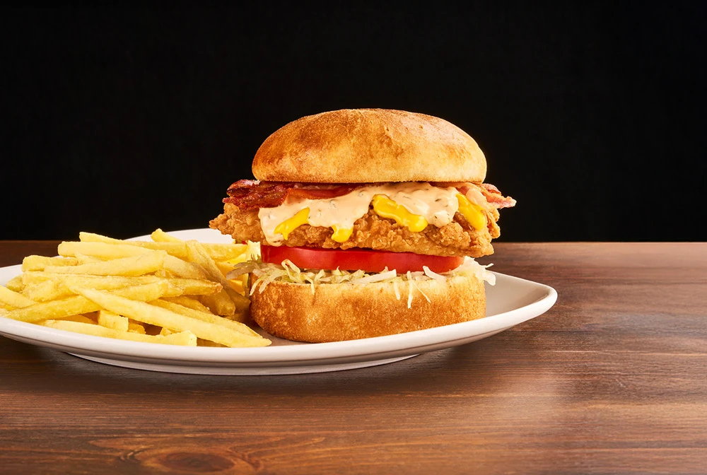 Panino*, strips di pollo* extra croccante, bacon, pomodoro, salsa cheddar, insalata iceberg, salsa Special servito con patate* Fries e salsa OWW