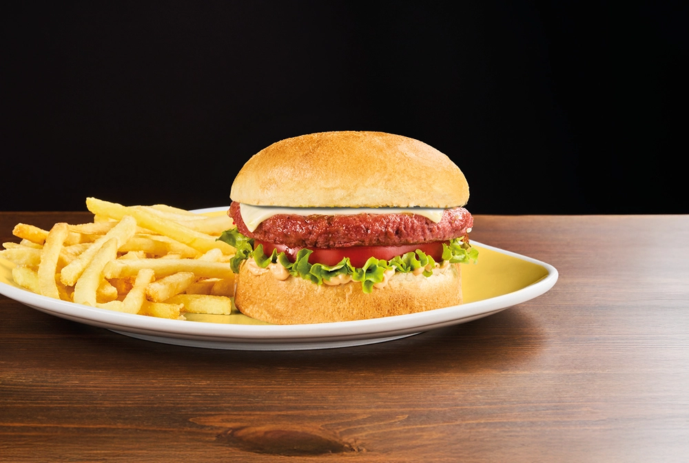 Panburger (prodotto da forno* a base di farina di riso e amido di mais), burger* no meat (burger con proteine 100% vegetali), formaggio fuso, pomodoro, insalata e salsa OWW, servito con patate* Fries e salsa OWW.