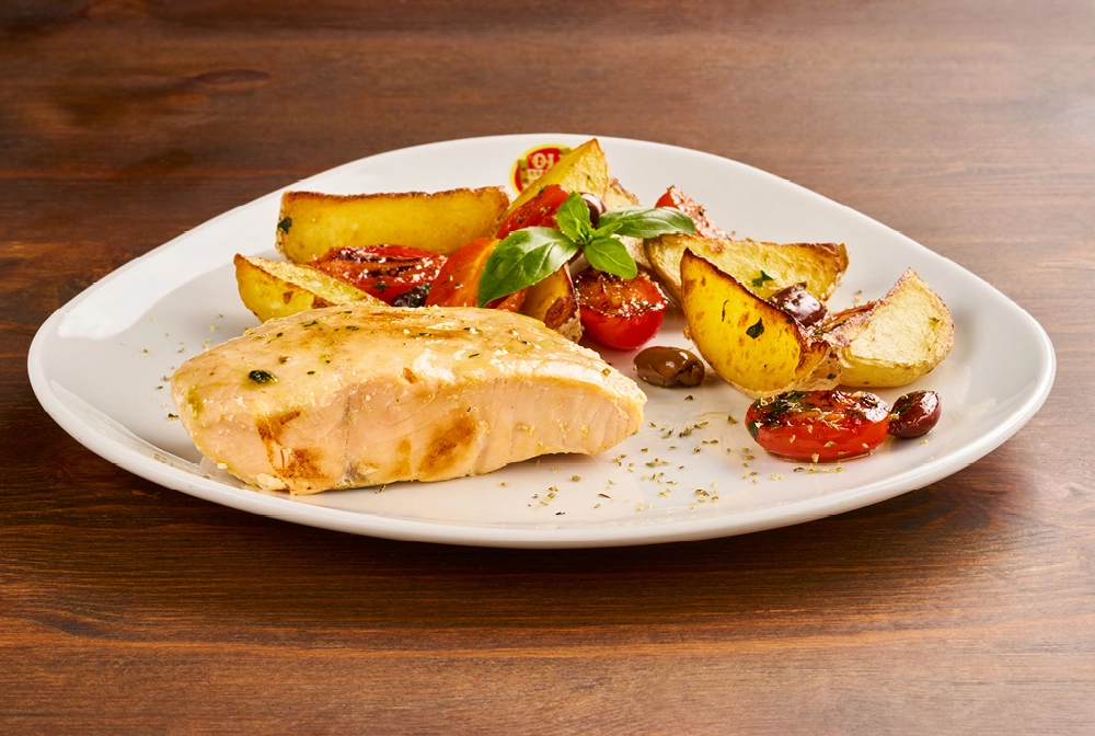 Trancio di salmone accompagnato con pomodorini datterino e olive al forno, salsa verde, basilico e patate al forno