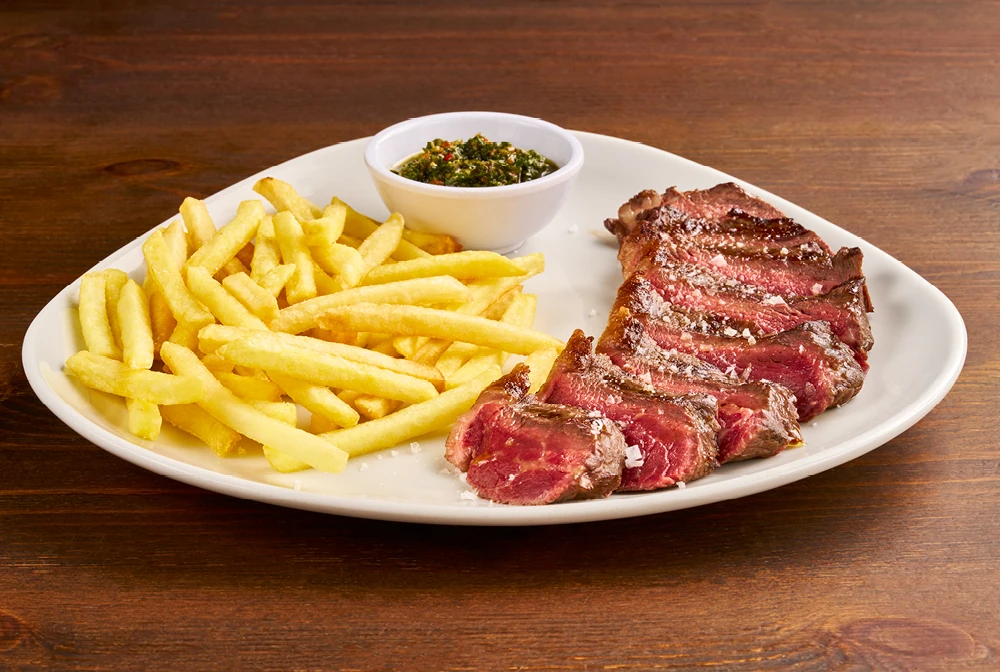 Tagliata di Picanha alla griglia, servita con patate* Fries e accompagnata da salsa Chimichurri homemade