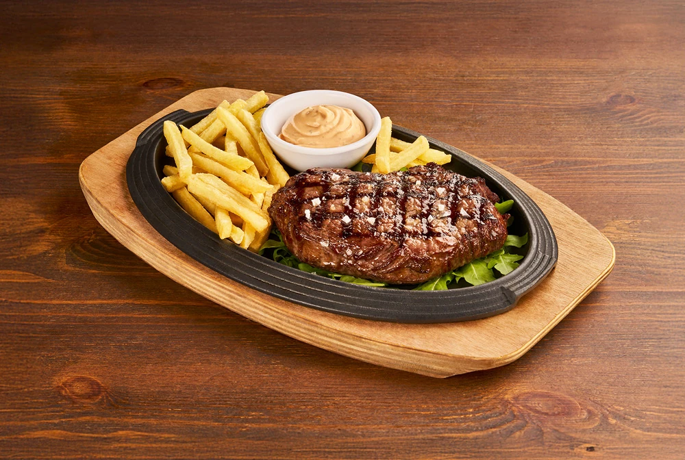 Manzo alla griglia, servito su letto di rucola e accompagnato con patate* Fries e salsa OWW