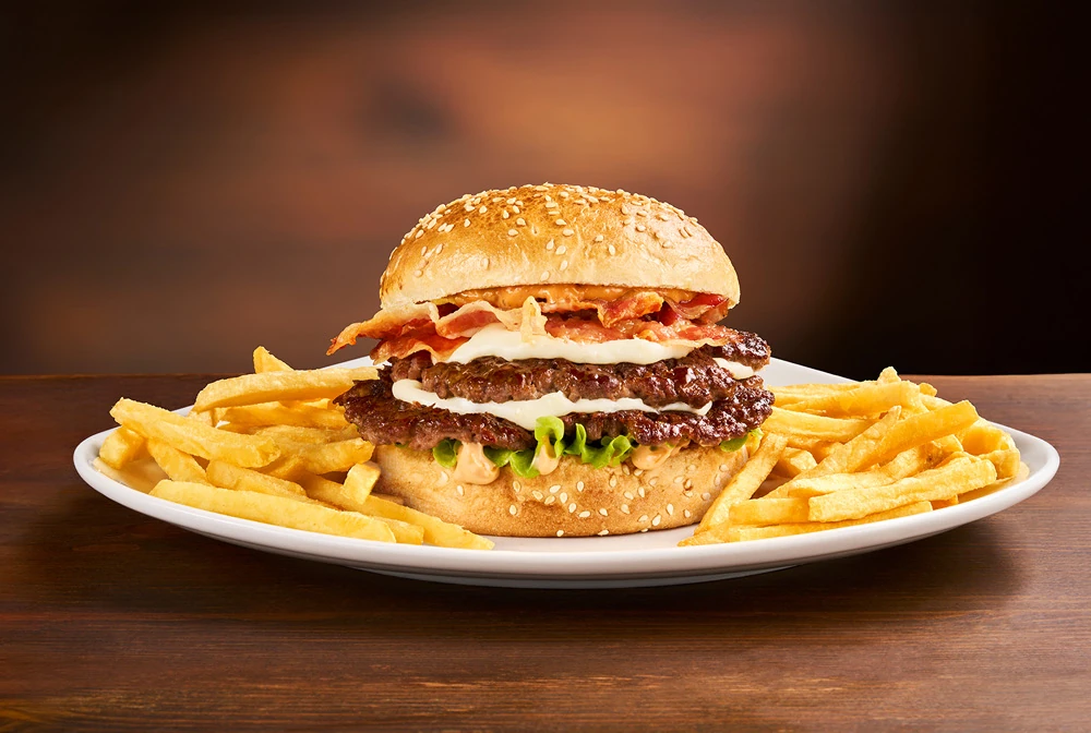 Panino con semi di sesamo*, doppio hamburger* di carne italiana, salsa al "Pecorino Romano DOP", guanciale nostrano, insalata iceberg, salsa maionese senapata con pomodori secchi, servito con patate* Fries e salsa OWW