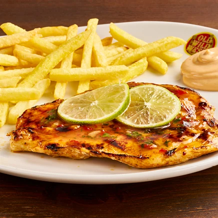 Petto di pollo* alla griglia accuratamente speziato, salsa Peri-Peri, lime, accompagnato da patate* Fries e salsa OWW