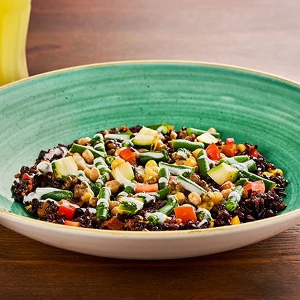 Riso (condito con mais, crema di pomodoro secco, lime, prezzemolo), mix di legumi, zucchine al forno, fagiolini*, dadolata di pomodoro, il tutto guarnito con dressing allo yogurt e salsa verde (bibita 0,3L o acqua 0,5L inclusa)