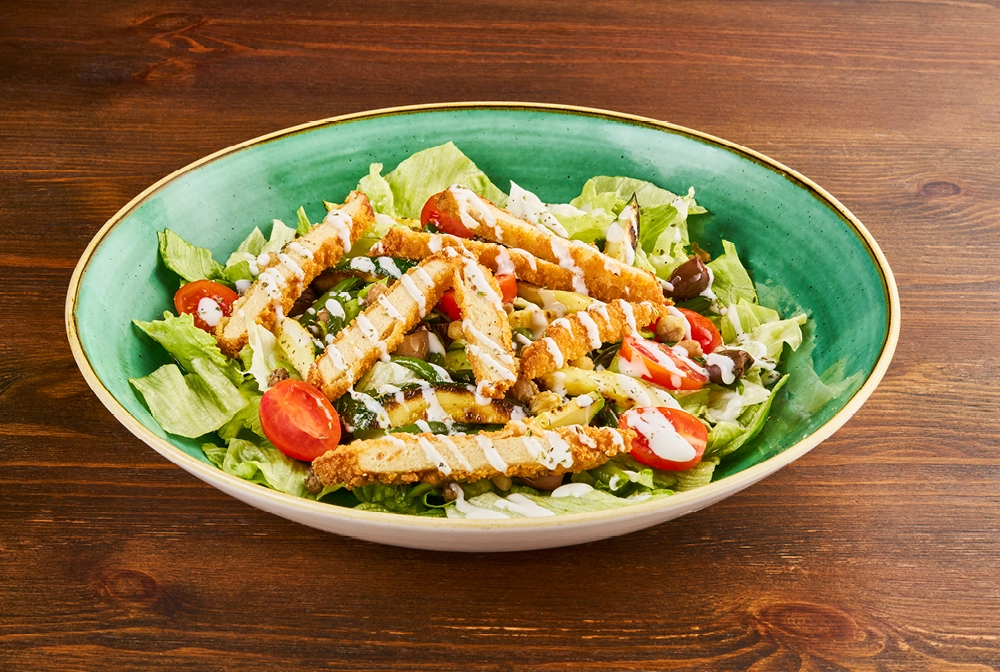 Insalata iceberg, fagiolini*, striscioline panate*, zucchine al forno, pomodorini datterino, mix di legumi, olive taggiasche, dressing allo yogurt, salsa verde e origano