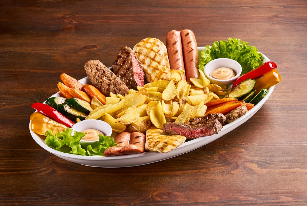 Manzo, petto di pollo*, salsiccia, wurstel e verdure al forno, accompagnati da patate* Premium Fries e salsa OWW